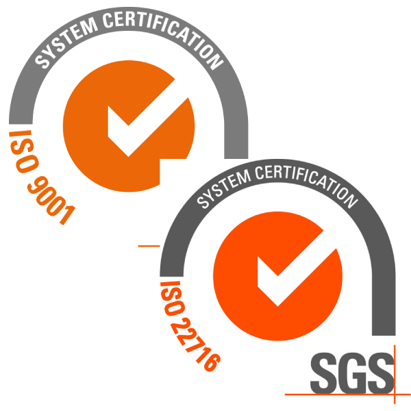 La certificazione ISO 9001 e ISO 22716 garantisce la produzione e la distribuzione di tutti i nostri prodotti.